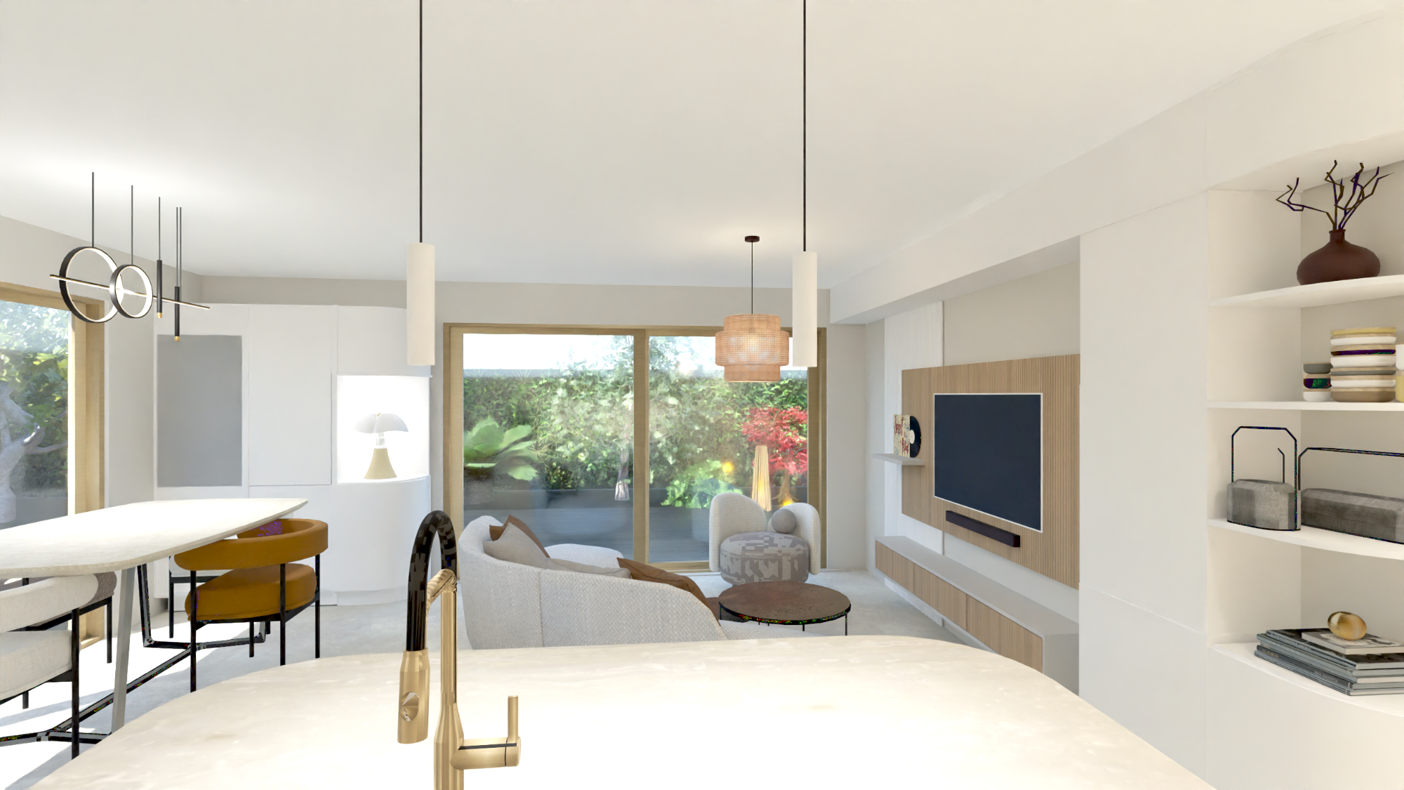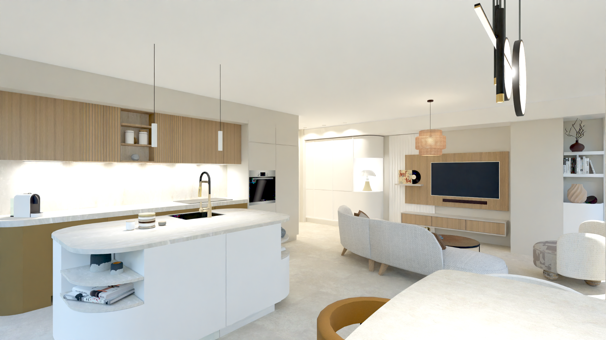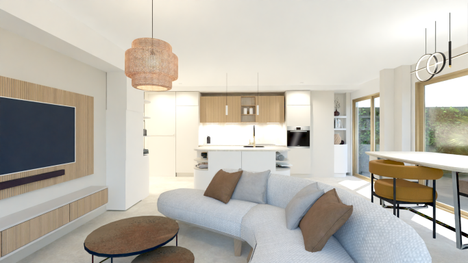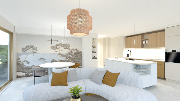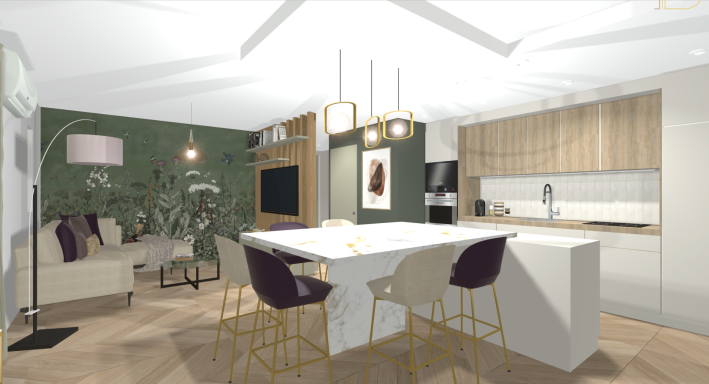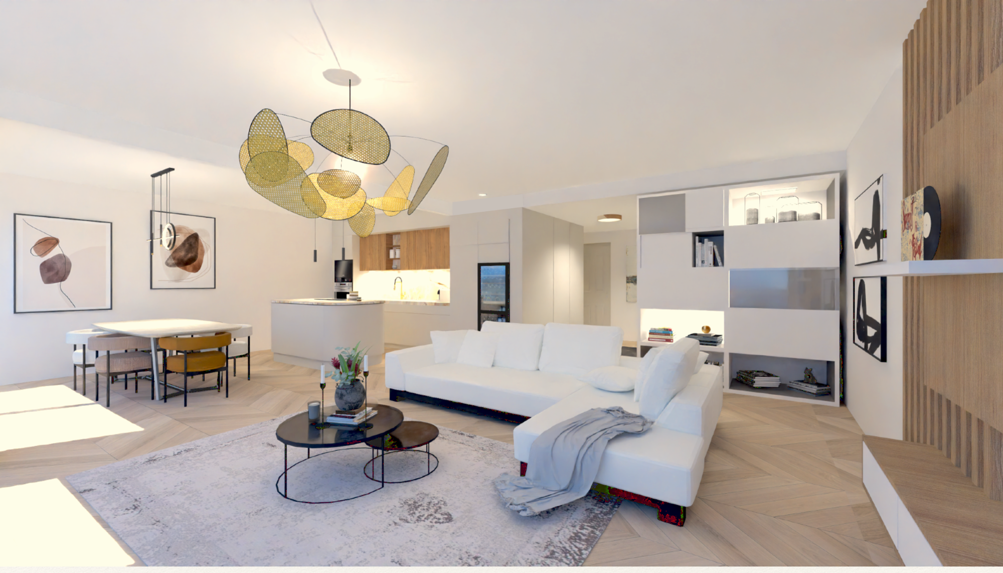 Les vues 3D permettent de saisir l'essence de cet espace, où le confort rencontre la convivialité, le design de mobilier et l'ambiance recherchée. Les volumes et les distances sont réelles et reflètent votre futur intérieur avec la plus grande fidélité.